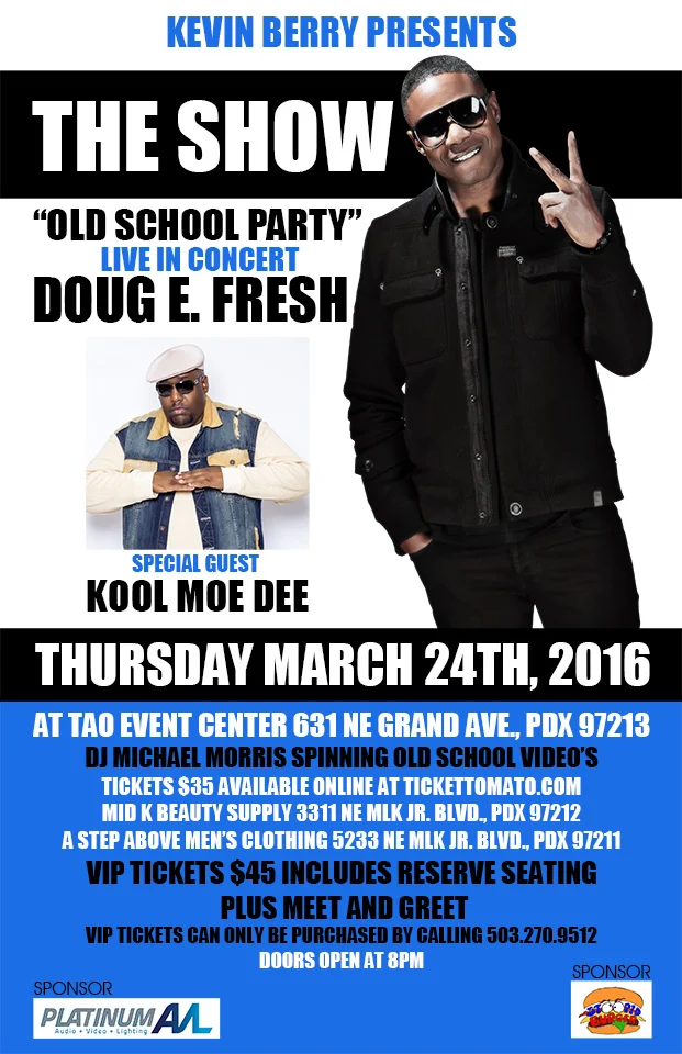 Peace world! Here's one you most def want to know about! The worlds greatest entertainer Doug E. Fresh is coming to Portland and he's bringing Kool Moe Dee with him. You can get tickets to the event HERE. Portland - Lets Go!!!!
